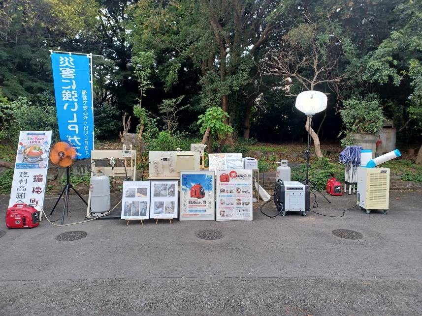 西多摩支部瑞穂地区「瑞穂町燃料商組合」は瑞穂町へ以前より14台導入しているLPガスを燃料として発電する発電機でスッポットクーラー・野外投光器を稼働させ訓練参加者へ見学していただいた。